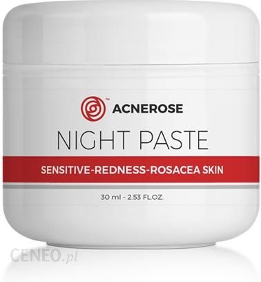 Pasta na noc Acnerose to innowacyjne rozwiązanie, które pozwoli skutecznie walczyć z dolegliwością, jaką jest trądzik różowaty. Podczas snu w cerze zachodzą naturalne procesy, służące regeneracji i gojeniu naskórka oraz łagodzeniu istniejących stanów zapalnych. Dlatego właśnie to najlepszy czas, by intensywnie zadbać o skórę.Pasta Acnerose zmniejsza wykwity, takie jak grudki, czy krostki oraz niweluje zaczerwienienia. Przy tym kompleksowo pielęgnuje delikatną cerę, która w przebiegu trądziku różowatego często bywa wrażliwa i w związku z tym wymaga starannie dobranych, naturalnych składników aktywnych.