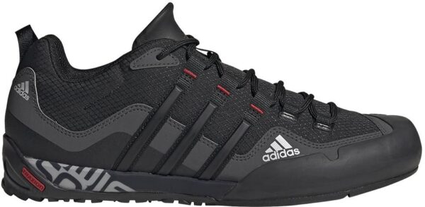 adidas Terrex Swift Solo to buty outdoor męskie w czarnym kolorze z szarymi oraz czerwonymi detalami. Cholewka tych butów wykonana jest z połączenia wysokiej jakości materiałów syntetycznych oraz tekstylnych. Podeszwa środkowa z pianką adiPRENE gwarantuje doskonałą amortyzację. Podeszwa zewnętrzna w systemie Traxion zapewnia doskonałą przyczepność w różnorodnych warunkach. Dodatkowa gumowa osłona na czubach chroni palce stóp przed uderzeniami przednia częścią obuwia w twarde lub ostre przeszkody. Otok podnosi także wytrzymałość samego buta wynikająca z takich uderzeń. Buty outdoor męskie adidas Terrex Swift Solo przeznaczone są do trekkingu, pieszych wędrówek, sprawdzą się w codziennym użytkowaniu.Technologie:Traxion – System poprawiający przyczepność. Wystające elementy w podeszwie zewnętrznej, zapewniające przyczepność i chroniące przed poślizgiem we wszystkich kierunkach (bocznych i liniowych). System poprawia także zwrotność i szybkość.adiPRENE – jest to specjalna pianka amortyzująca odpowiedzialna za wytłumienie wszelkich drgań wynikających z intensywnego użytkowania obuwia. Z całą pewnością docenią ją osoby które wiedzą jak ważna jest amortyzacja w pełnym poczuciu komfortu użytkowania. Pianka zastosowana jest na całej objętości podeszwy.