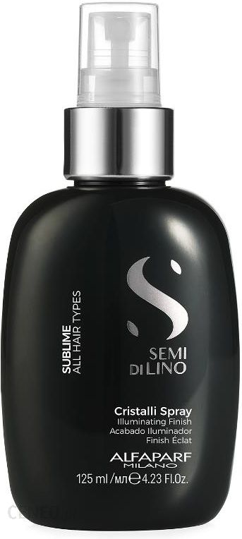 Alfaparf Semi Di Lino Sublime Cristalli to cudowny spray nabłyszczający w formie płynnych kryształków. Kosmetyk służy do ostatecznego wykończenia fryzury, dodania jej blasku, świetlistości i lekkości. Kilka naciśnięć atomizera sprawi, że przeciętne uczesanie nagle stanie się cudownie żywe, świetliste, pełne refleksów i mieniących się akcentów.Serum nabłyszczające Alfaparf Semi Di Lino Sublime Cristalli stosuje się na suche włosy bez spłukiwania. Ułatwia rozczesywanie pasm, wygładza czuprynę i ją ujarzmia, zapobiegając puszeniu i odstawaniu pojedynczych włosków. Chroni fryzurę przed wilgocią, przedłużając efekt modelowania. W składzie kosmetyku znajdują się: olej z siemienia lnianego i witamina E. Te komponenty zabezpieczają przed utratą wilgoci, nawadniają komórki, wygładzają strukturę pasm i sprawiają, że włosy są rozkosznie miękkie, gładkie i lekkie.Pojemność:125ml