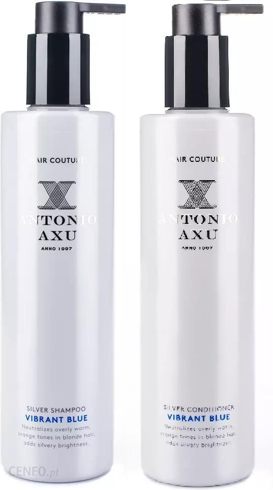 Silver Shampoo Vibrant Blue 300 mlOdżywczy fioletowy szampon, który neutralizuje pomarańczowe i podkreśla chłodne odcienie w blond lub chemicznie rozjaśnianych ciemnych włosach. Unikalne, korygujące pigmenty Antonio Axus wiążą się z włosami, tworząc piękny chłodny odcień blondu o wyjątkowej przejrzystości i promiennym blasku. Szampon jest bardzo łagodny i całkowicie pozbawiony siarczanów, dzięki czemu nie wysusza włosów.Sposób użycia: wmasować szampon w mokre włosy. Pozostawić na skórze przez 5-10 minut. Dokładnie spłukać. Produkt najlepiej stosować w połączeniu z Antonio Axu Care & Prepare Pre-Toning Shampoo i Antonio Axu Silver Conditioner.Bezpieczny dla włosów farbowanych i poddawanych zabiegom keratynowym.Silver Conditioner Vibrant Blue 300 mlNiebieska odżywka, która podkreśla chłodne odcienie i zwalcza ciepłe, pomarańczowe tony – szczególnie w przypadku ciemnych włosów, które były rozjaśniane chemicznie. Luksusowa mieszanka trzech naturalnych olejków (z nasion chia, abisyńskiego i arganowego) pomaga naprawić zniszczone włosy, zapewniając im dodatkowe nawilżenie, dzięki czemu stają się jedwabiście gładkie i nie puszą się. Lekka formuła zapobiegająca łamaniu się włosów chroni ich strukturę, aby uzyskać zdrowsze, bardziej lśniące blond włosy o pięknym, mieniącym się blasku.Sposób użycia: wmasować w mokre włosy. Produkt najlepiej stosować z Antonio Axu Care & Prepare Pre-Toning Shampoo oraz Antonio Axu Silver Shampoo.Bezpieczny dla włosów farbowanych i poddawanych zabiegom keratynowym.