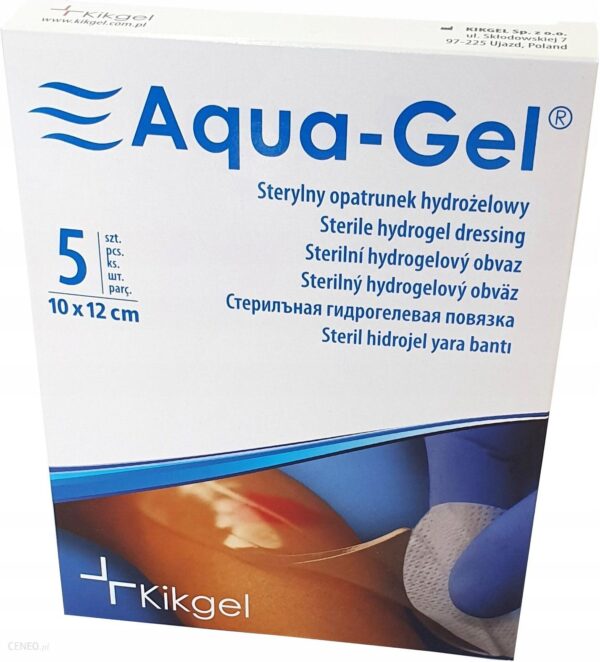 Opatrunek hydrożelowy AQUA-GEL® jest wodną kompozycją naturalnych i syntetycznych polimerów (poliwinylopirolidon, glikol polietylenowy i agar) poddaną promieniowaniu jonizującemu, które powoduje sieciowanie łańcuchów polimerowych oraz zapewnia sterylność opatrunku. Formę użytkową opatrunku stanowi przezroczysty, elastyczny płat hydrożelu o grubości 4 mm.Opatrunki AQUA-GEL® należą do najnowocześniejszej III generacji biomateriałów opatrunkowych. Stosowane są do opatrywania ran wymagających wilgotnego środowiska:-rany oparzeniowe-owrzodzenia-odleżyny-zespół stopy cukrzycowej-miejsca po pobraniu przeszczepów skórnych-otarcia-inne ranyOpatrunki AQUA-GEL® tworzą efektywną barierę przed zakażeniem zewnętrznym rany, są jednak przepuszczalne dla tlenu i leków. Charakteryzują się dobrą adhezją do zdrowej skóry i rany bez tendencji do przyklejania się. Zmiana opatrunku jest łagodna i bezbolesna dla pacjenta, nie uszkadza młodego, narastającego naskórka. Wraz ze zmienianym opatrunkiem z rany usuwane są wydzieliny oraz martwe tkanki.Opatrunki AQUA-GEL® są sterylne, przezroczyste, elastyczne oraz odpowiednio wytrzymałe mechanicznie. Poza takimi walorami jak łagodzenie bólu czy doskonałe efekty kosmetyczne (szczególnie przy oparzeniach) należy podkreślić niewielki nakład finansowy przy stosowaniu opatrunków AQUA-GEL®. Dzięki nim czas leczenia ulega skróceniu oraz odnotowuje się zmniejszone zużycie gazy, bandaży, antybiotyków i leków stosowanych w leczeniu tradycyjnym.Sposób użycia:Aqua-Gel umieszcza sie dowolną stroną na powierzchni rany. Należy stosować opatrunki o wielkości odpowiadającej rozmiarom rany. Opatrunek należy zabezpieczyć przylepcem włókninowym, folią adhezyjną Episil lub bandażem Adva-co (przy kompresjoterapii).Opatrunek może być stosowany także w kompresjoterapii.Właściwości opatrunkuOpatrunek AQUA-GEL ® wykazuje następujące właściwości:-likwiduje ból, dając choremu uczucie kojącego działania,-stanowi barierę dla bakterii z zewnątrz,-zapewnia dostęp tlenu do rany,-zapobiega powstawaniu przerostowych blizn,-umożliwia łatwe doprowadzenie leku do rany bez usuwania opatrunku (poprzez nawilżenie zewnętrznej powierzchni opatrunku roztworem leku, wprowadzenie leku pod powierzchnię opatrunku lub spęcznienie w roztworze leku przed założeniem),-wykazuje dobrą adhezję do zdrowej skóry i rany bez tendencji do przyklejania się, co umożliwia bezbolesną zmianę opatrunku,podczas zmiany opatrunku usuwane są z rany wydzieliny, włóknik oraz tkanki martwicze pozostawiając nieuszkodzoną ziarninę,-jest elastyczny, miękki, lecz jednocześnie wystarczająco wytrzymały, dzięki czemu może być stosowany do pokrywania takich powierzchni ciała, których nie uruchomienie jest kłopotliwe np. stawy, dłonie, twarz itp.,-jest przezroczysty co umożliwia kontrolę przebiegu leczenia bez konieczności zdejmowania go, jest nie alergizujący.