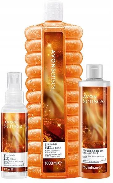 Zestaw kosmetyków Fireside Glow to przyjemny aromat, który ogrzeje twoje zmysły ciepłym, słodkim zapachem – idealny wybór na zimę.W zestawie:Płyn do kąpieli Fireside Glow 1000mlMgiełka do ciała Fireside Glow 100mlŻel pod prysznic Fireside Glow 250mlPoczuj otulające ciepło i słodycz goździków na przyjemnym akordzie skórzano-drzewnym naszego najnowszego płynu do kąpieli Fireside Glow. Pozwól jedwabiście miękkiej pianie rozpieścić twoje zmysły i zobacz, jak odpływają wszelkie troski i zmęczenie. Nasz płyn do kąpieli pomoże delikatnie oczyścić i nawilżyć twoją skórę, przygotowując ją do dalszej pielęgnacji.Mgiełka do ciała Fireside Glow to śliczny zapach w formie leciutkiego sprayu – delikatnie aromatyzuje skórę i przyjemnie ją orzeźwia. Eteryczna forma mgiełki sprawdzi się podczas letnich dni i zawsze wtedy, gdy masz ochotę na chwilę orzeźwienia.Przyjemna, kremowa konsystencja żelu pod prysznic Fireside Glow skutecznie oczyści twoją skórę, dbając o jej nawilżenie. Ochroni ją także przed ponownym wysuszeniem i otuli przyjemnym, ciepłym zapachem.Opis składników zestawu:Żel pod prysznic Fireside Glow 250 mlŻel pod prysznic Fireside Glow łagodnie oczyszcza skórę i rozgrzewa zmysły ciepłym, otulającym zapachem – idealny wybór na zimę.Żel pod prysznic Fireside Glow delikatnie myje i pielęgnuje skórę nawilżającą formułą. Przyjemnie odświeża ciało i otula je rozgrzewającą kompozycją, stworzoną specjalnie z myślą o zimowych dniach i wieczorach. To ciepło i słodycz goździków na bazie luksusowych, mięciutkich skórzano-drzewnych akordów.Jak stosować żel pod prysznic Avon?Nanieś niewielką ilość żelu na zmoczoną gąbkę, myjkę, szczotkę bądź bezpośrednio na dłoń. Rozprowadź po ciele, a następnie spłucz obficie wodą.InspiracjaSięgnij również po odprężający płyn do kąpieli i mgiełkę do ciała z tej samej linii.Działanie: nawilżająca formuła oczyszcza i pielęgnuje skóręNuty zapachowe: goździki, akordy skórzano-drzewnewygodne opakowanie, nadające się do recyklinguZastosowanie: nawilżający żel pod prysznic do każdego rodzaju skóry