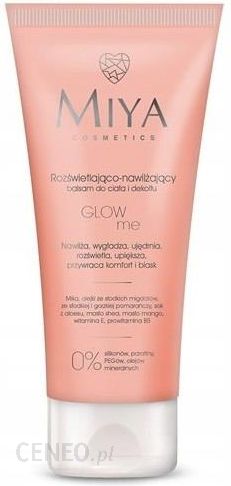 Miya GLOWme – rozświetlająco-nawilżający balsam do ciała i dekoltuNawilża, ujędrnia, wygładza, zmniejsza widoczność przebarwień, dodaje blasku.Działa natychmiast, bez wysiłku! Już po jednej aplikacji Twoja skóra jest nawilżona, aksamitnie gładka i pełna zmysłowego blasku. Przebarwienia i niedoskonałości są mniej widoczne. Bogaty w cenne masła, olejki, ekstrakty roślinne i witaminy.Masło mango i shea, olejki ze słodkich migdałów, z gorzkiej i słodkiej pomarańczy, nawilżają, wygładzają, pozostawiają skórę miękką w dotyku.Złota mika rozświetla i dodaje zmysłowego blasku.Sok z aloesu, witamina E i prowitamina B5 utrzymują prawidłowe nawilżenie skóry, poprawiają komfort i witalność.Przyjemna konsystencja, która idealnie się rozprowadza i szybko wchłania. Nie klei się, nie pozostawia tłustej warstwy, nie brudzi ubrań.