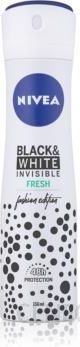 NIVEAAntyperspirant w aerozoluNIVEA Black&White Invisible Fresh Antyperspirant to produkt, który zapewni Ci skuteczną i niezawodną ochronę przed poceniem się, bez ryzyka pobrudzenia Twoich ulubionych ubrań. Zapewnia ochronę 5w1 i chroni przed nieprzyjemnym zapachem, poceniem, żółtymi plamami, białymi śladami oraz przed podrażnieniami. Antyperspirant nie pozostawia żółtych plam na białych ubraniach ani białych śladów na czarnych. Unikalna formuła chroni Cię przed nadmiernym poceniem się przez 48 godzin, jednocześnie pielęgnując Twoją skórę. Odświeżający zapach zapewnia uczucie świeżości i czystości. Jego łagodność dla skóry została potwierdzona dermatologicznie.Aerozol150 mlProduct ID: 88674,